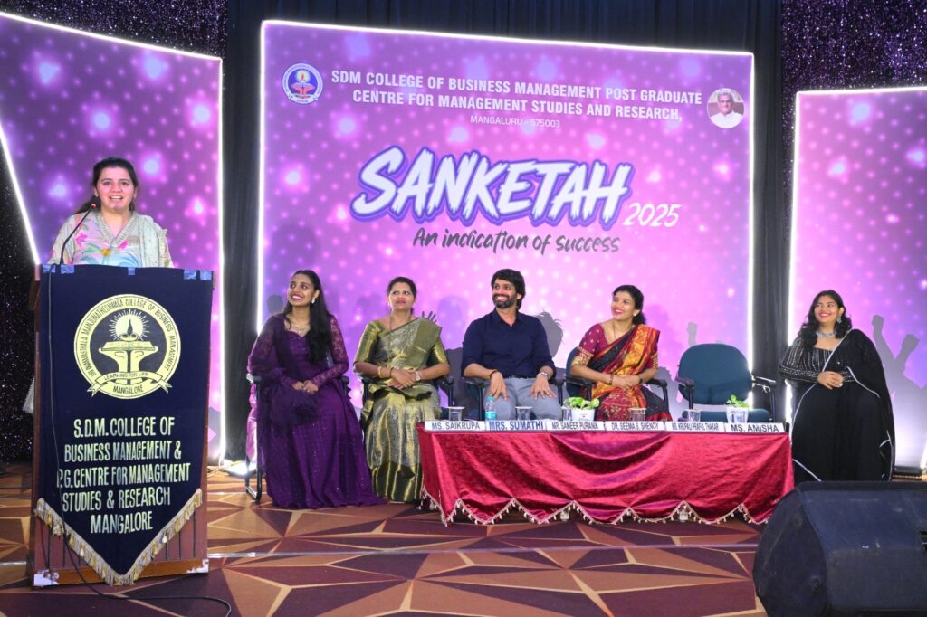 The institute celebrated annual day “SANKETAH 2025” on 29th August, 2025. Mr. Sameer Puranik, Director and Trustee, Sharada Group of institutions, Mangalore was the chief guest. He spoke on the importance of initiation and confidence in becoming successful leaders. He also encouraged the students to have a clear goal in life and put their 100 percent efforts and strive to achieve them. Alumna chief guest was Ms. Krupali P Thakar, Team Leader at J P Morgan Chase & Company motivated the students by narrating her own life story towards a successful career. Winners of various competitions conducted by forums, cells and clubs under student consortium were honoured during the occasion. Director of the institute, Dr. Seema S. Shenoy presented the comprehensive report on varied activities and achievements of the institute during the academic year 2024 – 25. Faculty coordinator of student consortium Mrs. Sumathi announced the best outgoing students, adjudged on different criteria. Ms. Amisha, president and Ms. Sikrupa M., vice president of student consortium were present on the occasion. The formal programme was followed by cultural performance by the students.